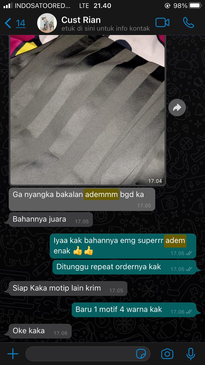 Terbuat dari Cotton Silky Premium (Kami Importir Satu-Satunya di Indonesia) yang terkenal dengan kelembutan dan kenyamanannya, Material ini terkenal sangat lembut, dan seratnya rapat namun tidak panas saat dipakai.